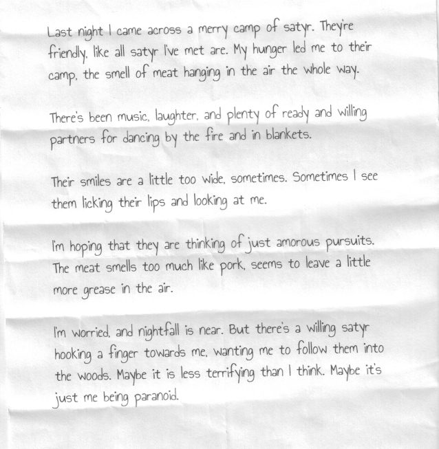 Last night I came across a merry camp of satyr. They're friendly, like all satyr I've met are. My hunger led me to their camp, the smell of meat hanging in the air the whole way.