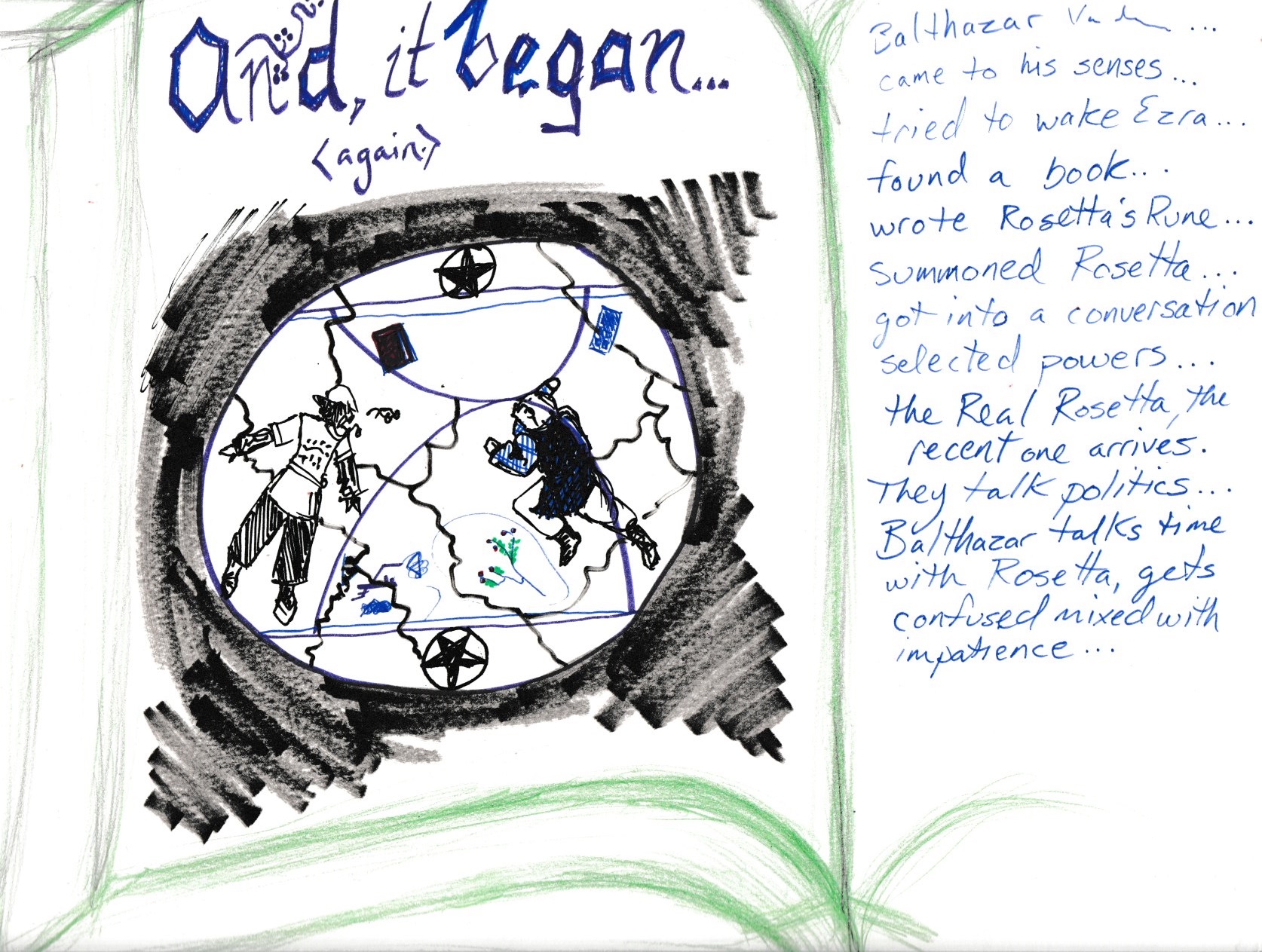 Date: 06/27/2017 Where dream occured: My home in Faerie Interpretation included: Yes In the great green room There was a bookcase and four windows and a picture of The sickly dragon of flame And a roaring fireplace And a table and a bed And a place to rest your head There was more, of course, but It needed to start its discourse So, the room had its views, and the Awakened, one assumes were soon stirring from their slumber... [Here is how the skerry looked from above, when all was well] We all woke up in the skerry, wearing dream-forms. Orion and Cressida recognized the room as one from recent dreams, and recognized the dragon. Both had been to the room about a week before, and Cressida had been there in her dreams more times in the past. Melethiell was in the Dreaming for the first time. Orion mentioned the windows had not been there the last time. The west window held a view of great plains, with dips and valleys, and long hillsides, all waving with a mixture of long grass here, wheat there, and blue skies that travel into the horizon. No sound came from the window. Orion said that the dragon (who is believed to be Lucien's Dragon, a new form of an adventurer that some once knew) said the green room was made by the Dreamer, Masks, Sky and Space. Melethiell found a book and was able to make out a few pages, which I have reproduced here to the best of my ability. Melethiell noted that the book was about, among others, me, and indeed it involved a day where I was summoned to try and help Ezmerelda by Balthazar, which I will try to detail elsewhere. She then looked into a crystal ball, what comes next I'm going to put as my notes immediately after waking up said it, even though they are kind of incoherent, in case there is wisdom to be gained. At first, nothing happens, and then the nighttime sounds of peepers can be heard. Crickets. Far away, and yet near. The green room's wall, they flucuate with colors, from green, all the way to dark blue, and every hue in-between back to green. There's a set of words, something being said. Something being repeated. Rules? Regulations? The bears, they are still muzzled, but they are actually shifting in their seats, shifting in the painting, as music begins to play. The griffin, it glides gently in and out of view around and over the moon, and whenever the frame would obscure its turn, it still comes back, flapping lazily along. The oil lamp, its flame flickers and dances. 10 fingers, 10 laws that I live by. and the music begins to slowly fade out, too. something about musicians and life... After this, the room returned to its more stationary look, as when we first woke up. Orion and Cressida recognized the song, and said they understood more this time. They were all rules of survival, something to counter the calming music. Orion caught more of them than he had before. Melethiell and Cressida looked under the bed, and were delighted to find that while it was particularly, light-swallowingly dark there, a gray cat came out. The voice of a woman I once knew, which I take as the voice of the sickly dragon within this dream, spoke for the first time, saying That is no ordinary domesticated creature. The cat also attracted the attention of the sickly dragon's picture. As the cat became acquainted with some of the dreamers, it was shown to have six limbs, not four, and a little red bow behind one ear, and later we noticed two spiked tendrils emerging from its front shoulderblades. The voice continued, One of these creatures, in reality, lies with the Knight's Squire. I believe this means it is the kitten of a Displacer Beast. The Message, however, is still here. In a way. As many months as there are in a year, I can answer questions of thee. You are four. You may choose to share, or split equally, or have one speak, or as you wish... but only Months of the Year is the limit. I brought up that some consider there to be 13 months in a year, but this was shot down. As we considered what to ask, I examined a bottle with a curious label that we had not been able to decode. It contained a viscous liquid. I concluded the label, written in a script I do not know, meant "T'et'ulinyi." It reminds me of "Tiledike," meaning Belief in an old language, but no meaning for this word came to me. I noticed that the dragon's picture, and its voice, could not have been in the green room when Masks made it. I am uncertain of what to make of this: How much the room was set up to allow just this sort of thing to happen, with the right dreamers, and how much it was a lucky accident, using something Masks had created for entirely different purposes. For our first question, I asked for the meaning of "T'et'ulinyi." I was told it is of a language no longer spoken in the Realms, and roughly means "Drink me." Second question, is there a connection between the Dreamer and Time Snarls? No, though this could be changed by time magic, such as the Time Snarls. Third question, how can we best stop the further creation of Time Snarls? At the current time, locate those in Quar's "Pantheon" and remove them as we can. Fourth question, who is the most vulnerable of Quar's Pantheon? At this point, it is an even tie between Ush'dui and Har'dro [note: I killed Ush'dui a little over a year later]. Orion noted that Ush'dui was connected with a crazy old man who might have worked for her, and someone called the Playking, who might have been a rival of the old man. [See Dream 1-4-19 for another enigmatic Playking reference] Fifth question: How can we find Ush'dui? One can find her toying with minds in The Dreaming, for she plays not in the mortal Realms since her last run-in with strong mages, and the last Dream Master of the time. Sixth question: What is her most exploitable weakness? A most intriguing question, my Master [Lucien] thinks. From him, he wagers that games of the mind are both her strength and her weakness; indeed, the rest of Quar's Pantheon are much more intelligent and wiser than her, a