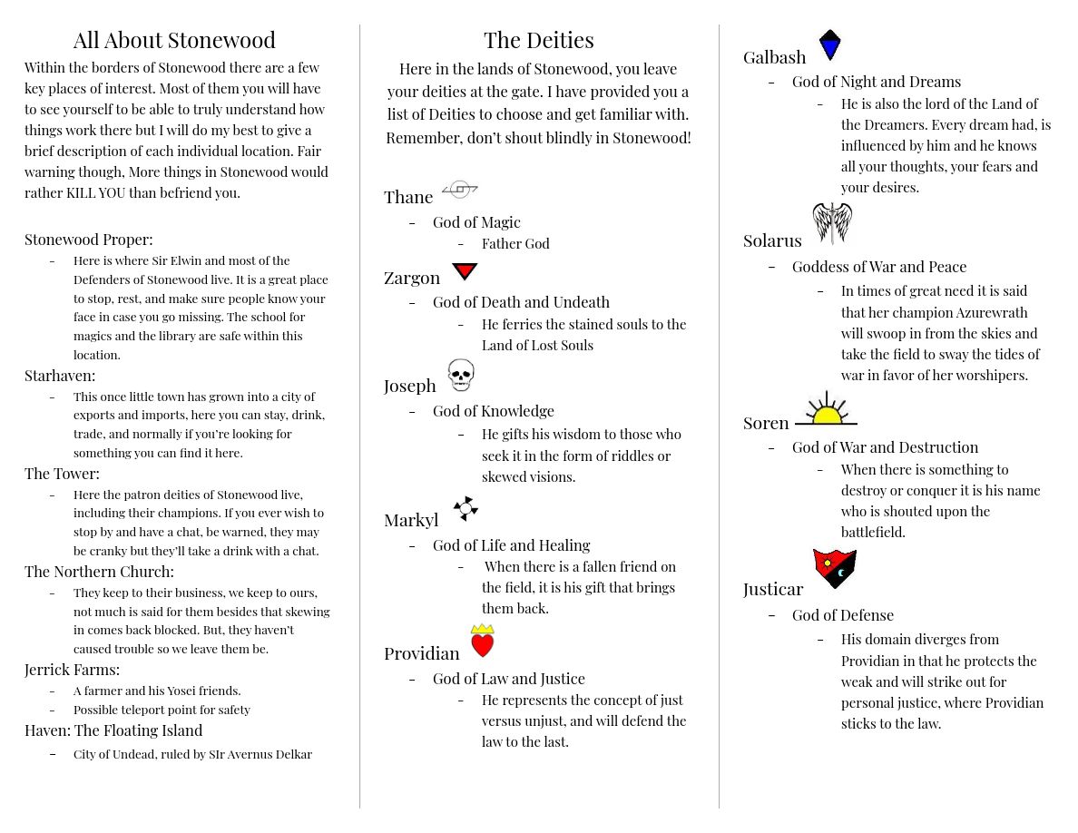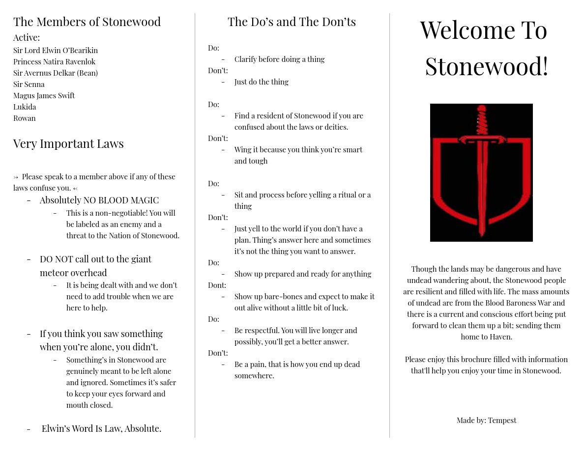 Welcome to Stonewood PamphletThis pamphlet was distributed on October 2nd, 1021, at the beginning of the gathering known as "Exotic Items, Creatures & Wares 3.5" |